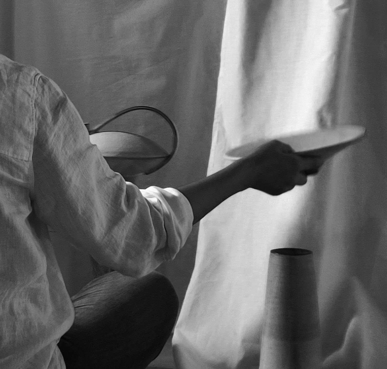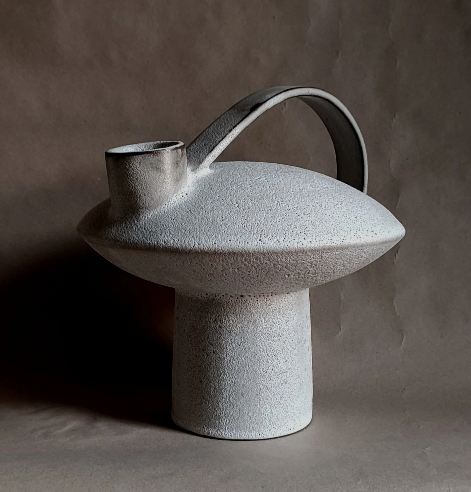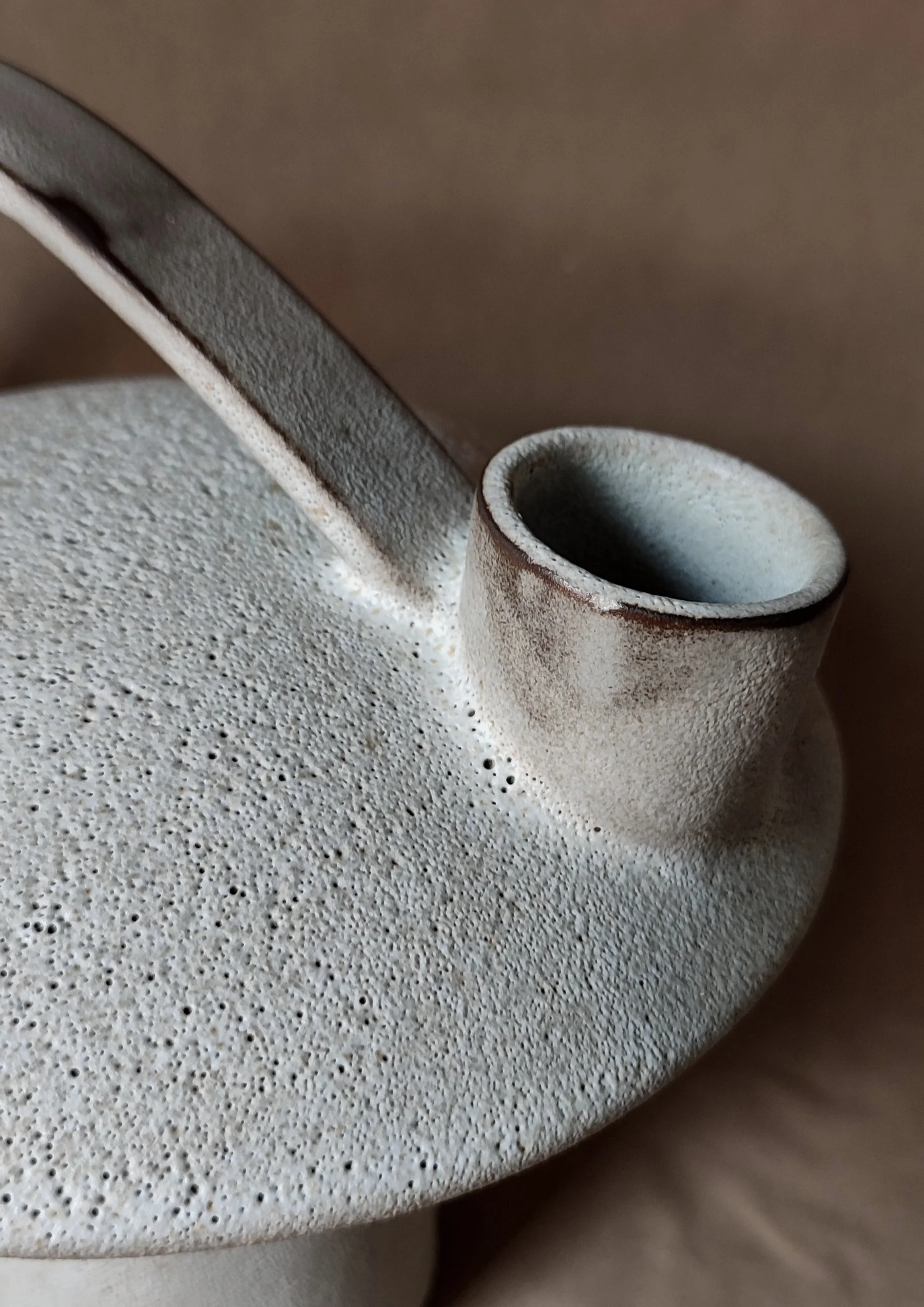 Il vaso conico tronco della collezione, "Sogno Errante", evoca un senso di scoperta e avventura. Tornito a mano con terra vulcanica, presenta intricati dettagli che richiamano un paesaggio senza tempo. La superficie delicatamente grezza diventa un incantevole invito a toccare e osservare da vicino.Il piatto che si abbina al vaso, "Semplicità Vagabonda", simboleggia l'essenza del neo-nomadismo. Con linee pulite e minimaliste, questa creazione presenta la medesima finitura e un design senza tempo. L'aspetto rustico ma liscio del vaso evoca la tranquillità e la semplicità della vita nomade, invitando a un viaggio interiore verso la pace e la serenità. Infine, l’askos, "Riflessi Itineranti", cattura l'indefinibile legame tra il viaggio e il sé interiore.